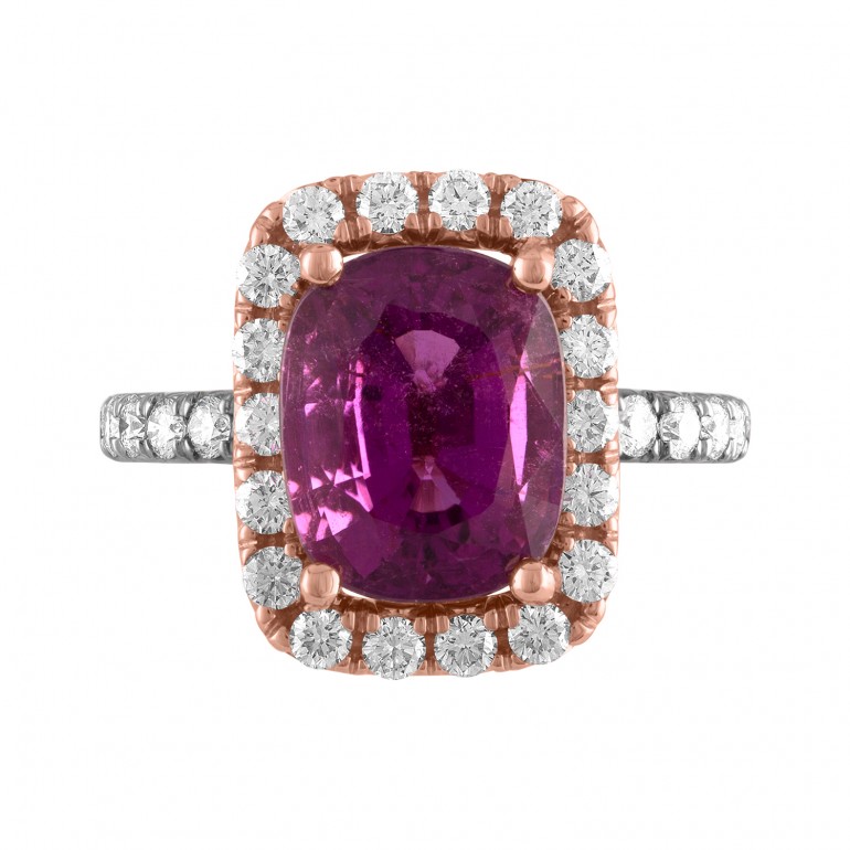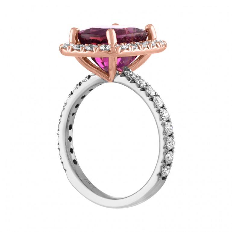 This amazing pink tourmaline is beautifully encircled in pink gold and the white gold shank enhances the gold color contrasts. Really one of our favorites.