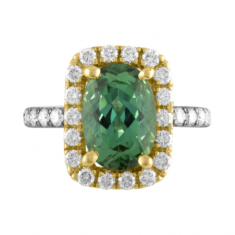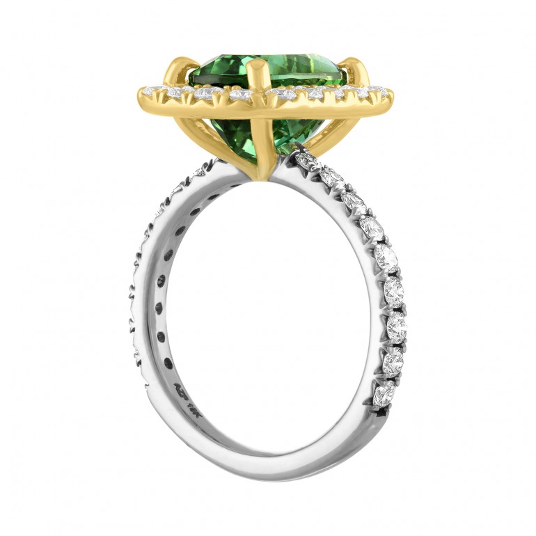 The green color of this Verdelite Tourmaline is beautiful and one cannot help but stare into is depths. This particular ring is made with a green gold halo and white gold shank.