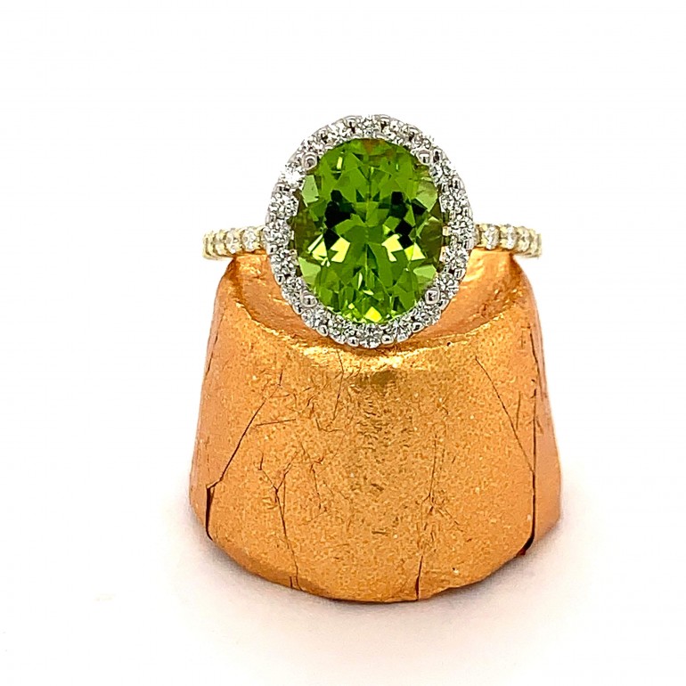 This spearmint green Peridot features a brilliant 4 carats oval stone in our four prong signature setting. A white gold halo and a vibrant green gold shank encrusted with 0.5 carat diamonds makes this gem is a sweet treat.