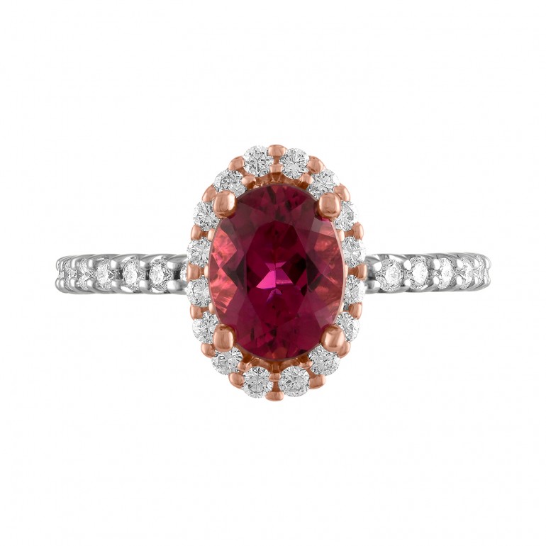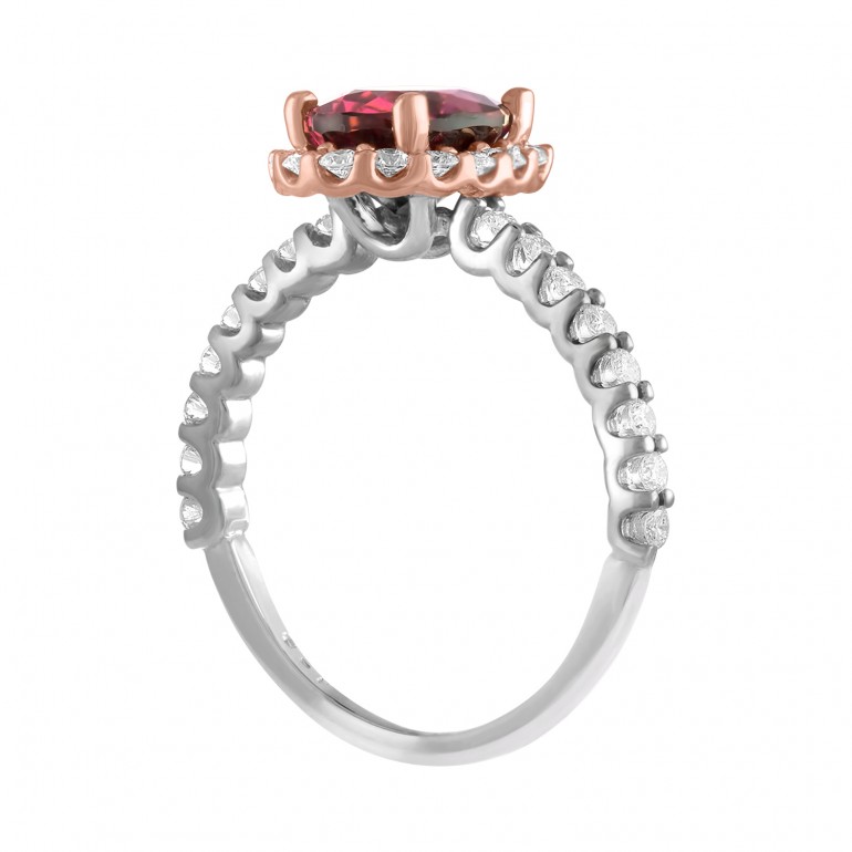 This U halo ring has a lovely pink tourmaline surrounded by diamonds set into the pink gold halo. The white gold shank is set with beautifully cut diamonds to enhance this entire ring.
