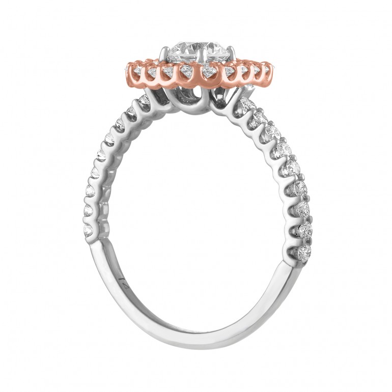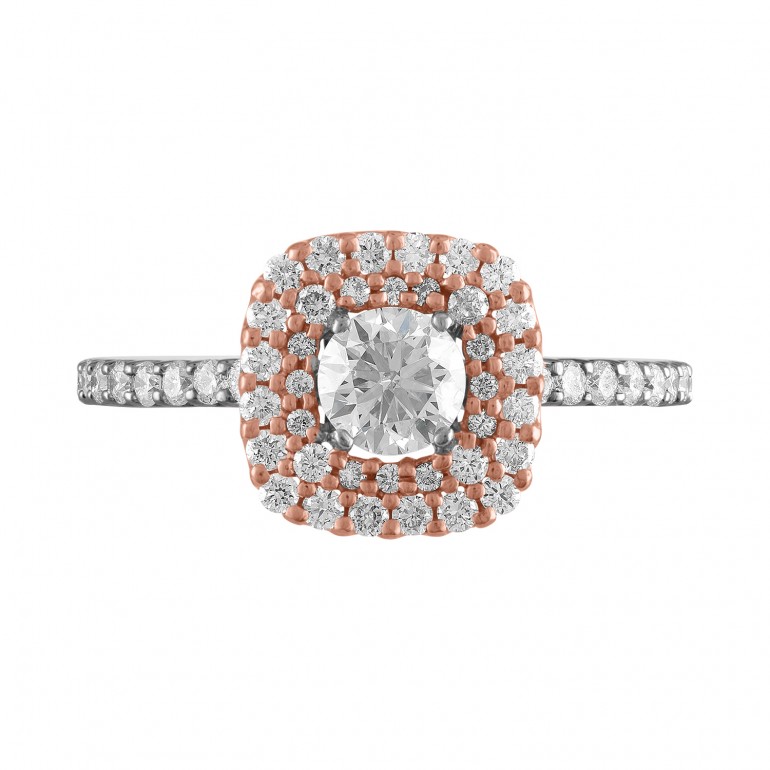 This double halo engagement ring is shown with a pink gold halo and white gold shank. It can also be made with yellow gold and platinum in any combination of metal colors you choose.