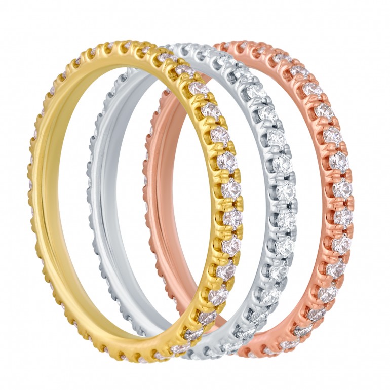 Our split prong tri color gold stackable eternities shown here in the 1/2 carat each ring version.