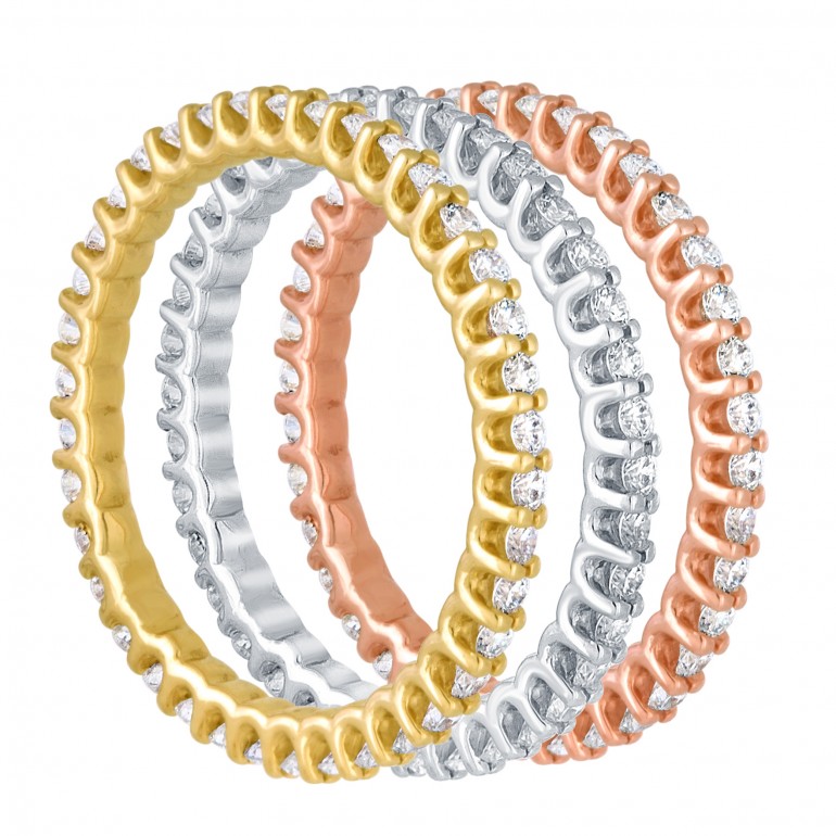 Shown is our 1/2 carat U eternities in pink, yellow and white gold. These make beautiful stackable rings and are avaiable in a wide range of diamond total weights.