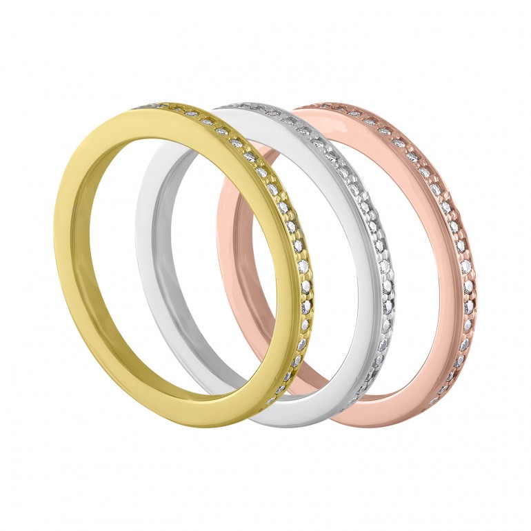 Our micro eternities are perfect as guard rings and stackable rings. They are pictured in 18k yellow, white and pink gold.